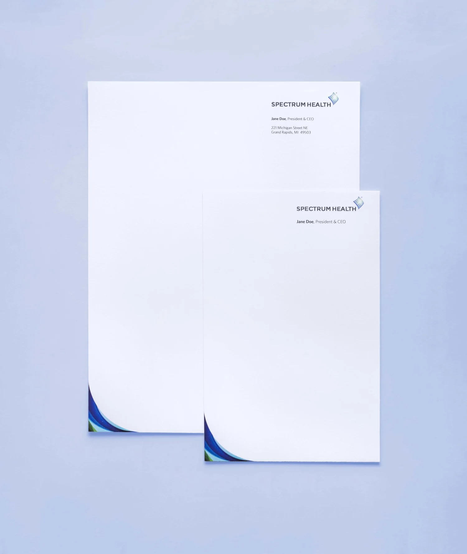 We had the pleasure of creating the welcoming graphics for the new CEO at Spectrum Health. Once the look was established, the design was woven into all of her introductory material—from environmental design to print—then followed through to her executive stationery and digital communication platforms.